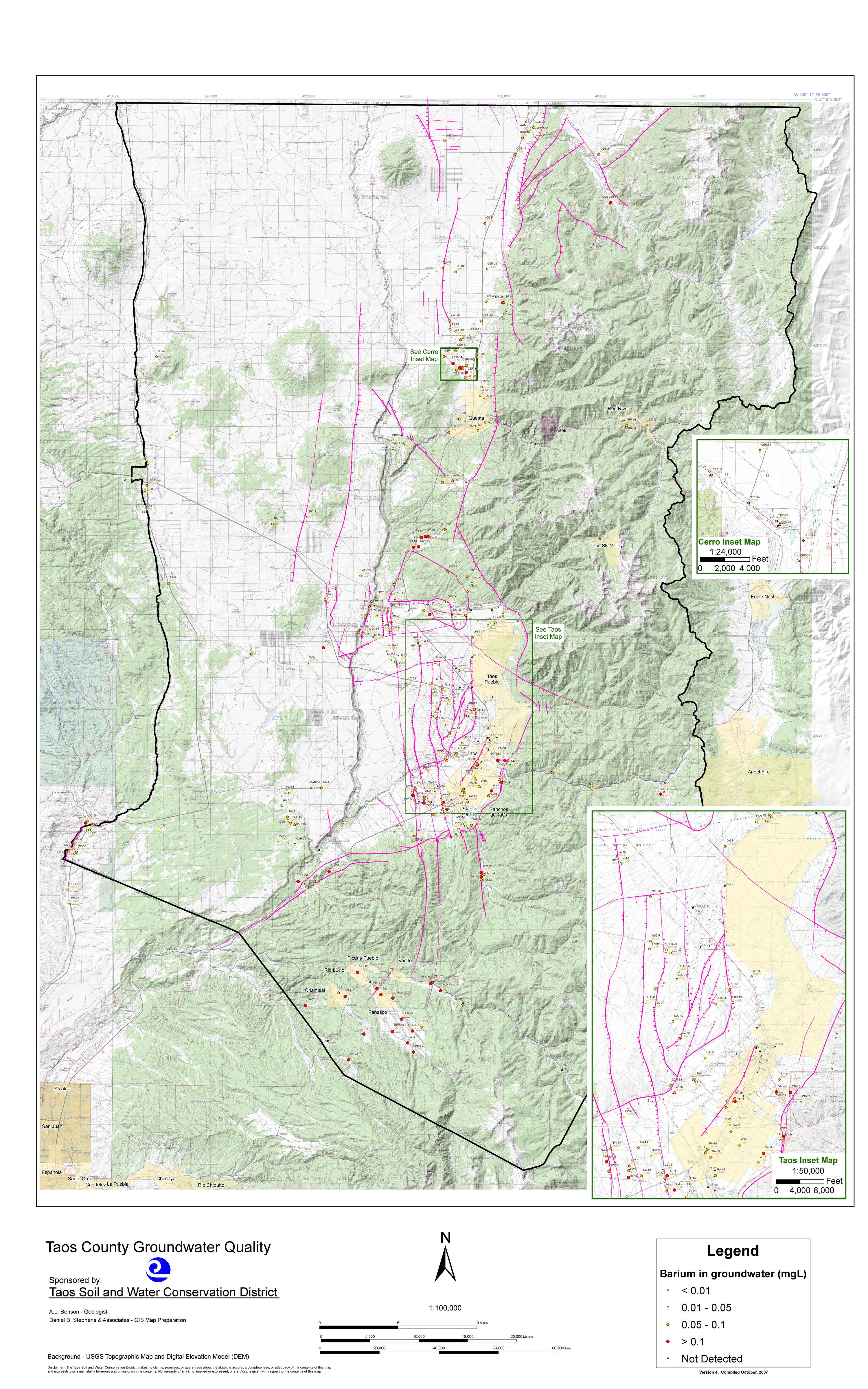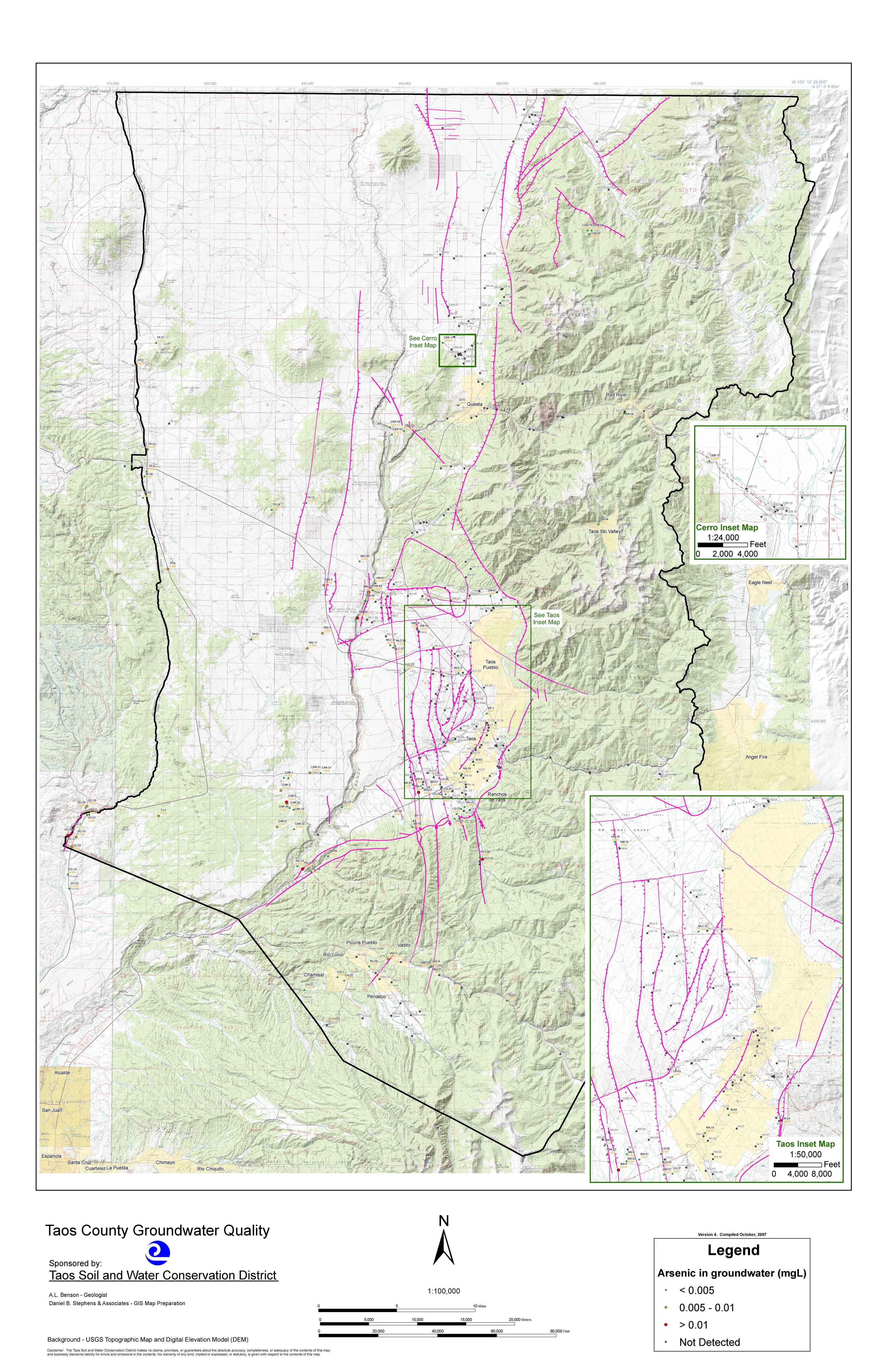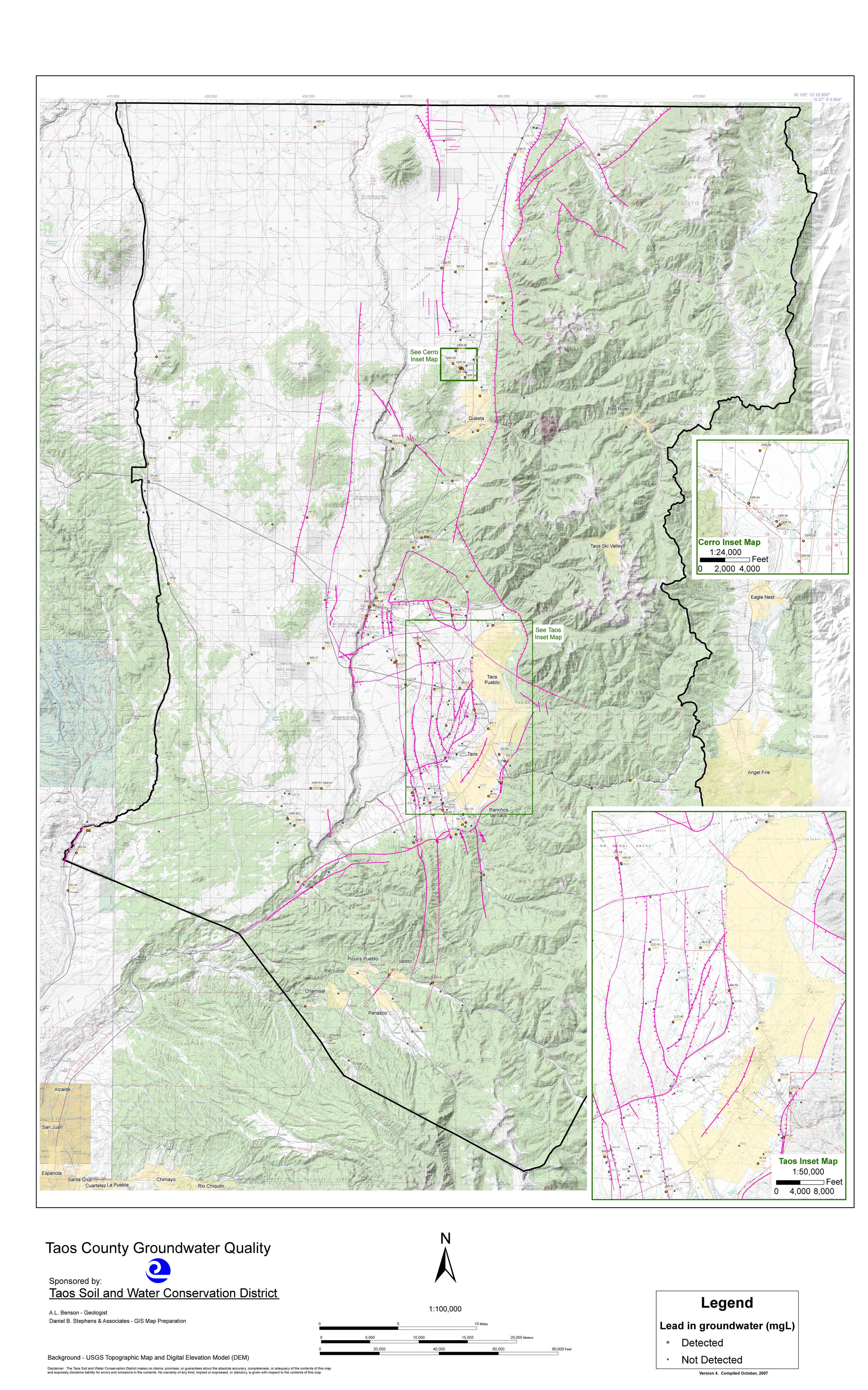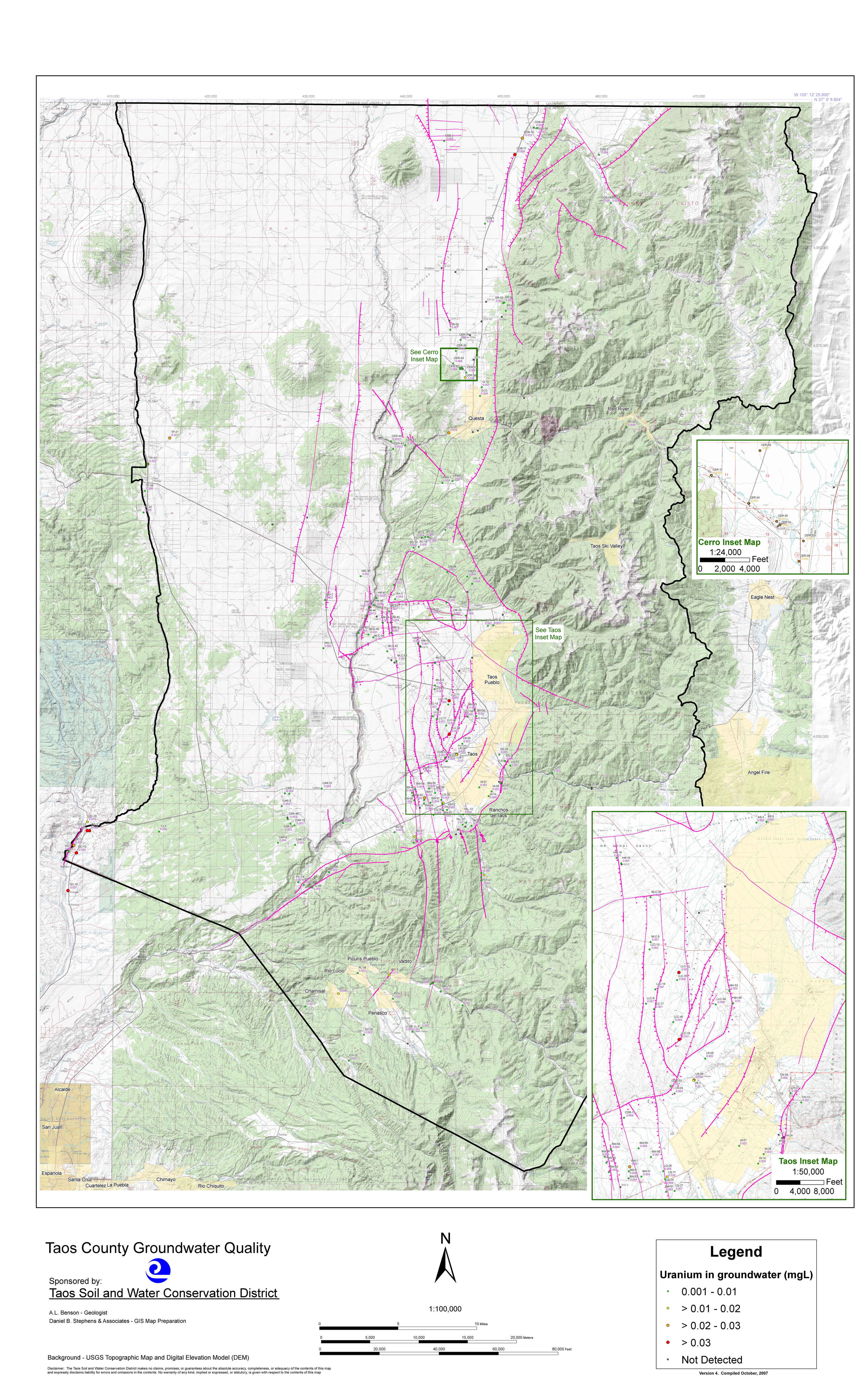 In the spring of 2004, Taos SWCD partnered with USGS and various local entities to fund an high-resolution aeromagnetic survey of the Taos Valley. Results of this survey have confirmed most of the District’s original fault locations as well as supporting the aquifer compartmentalization theory. These findings were presented at the New Mexico Geological Society 55th Annual Field Conference and published in the corresponding guidebook under the title of “Groundwater Geology of Taos County” by A.L. Benson. Additionally, the District contracted the NM Bureau of Geology to analyze approximately 500 water well samples for 39 different elements and ions. In late 2004, the District contracted with various water quality experts to further compile and research additional water samples.
